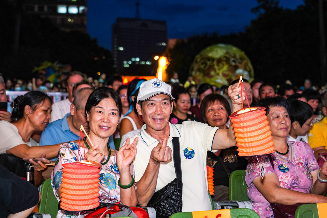 9月15日晚,由中共广州市荔湾区委宣传部指导,广州文化公园主办的“活力湾区 新彩广州”2024年中秋灯会亮灯仪式暨“月是故乡明”中秋音乐会,在文化公园中心台举行。各式花灯流光溢彩、五彩缤纷,中心台欢歌喜舞、余音绕梁,把文化公园装扮成了一片欢乐的灯海。