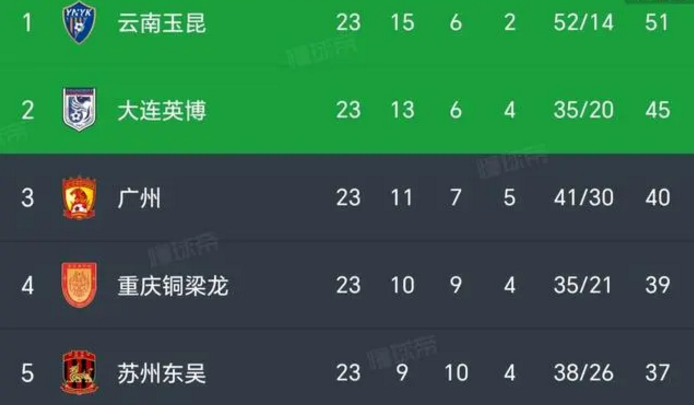 本轮,重庆铜梁龙主场以3比2击败“领头羊”云南玉昆,积分上升到39分,仅比广州队少了1分。而排第二位的大连英博本轮则在主场以1比1战平石家庄功夫,积分为45分。