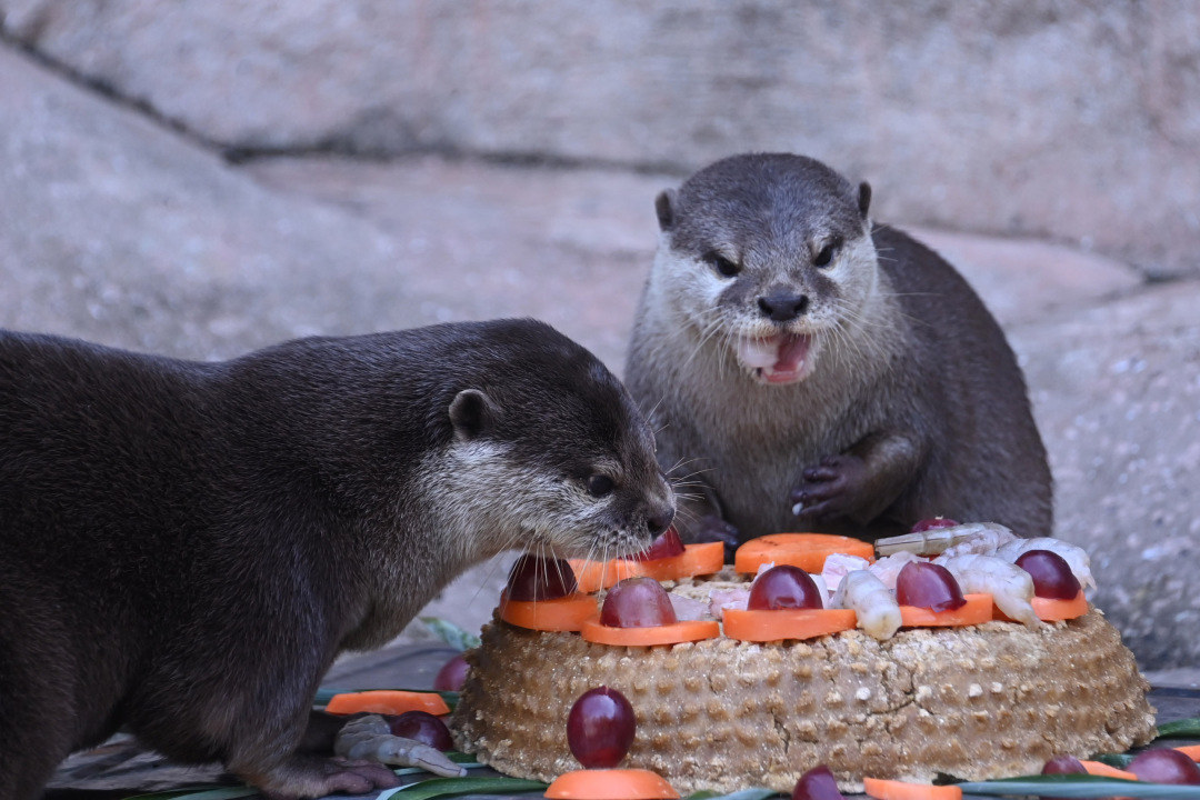 亚洲小爪水獭今年4月入住动物园,第一次在深圳吃“月饼”。饲养员为它们准备了“鱼香月饼”,采用窝头做成“大月饼”,上面摆放新鲜生鱼片和虾肉,再有红萝卜和提子点缀,散发阵阵“鱼香”吸引小爪水獭前来品尝,大快朵颐。