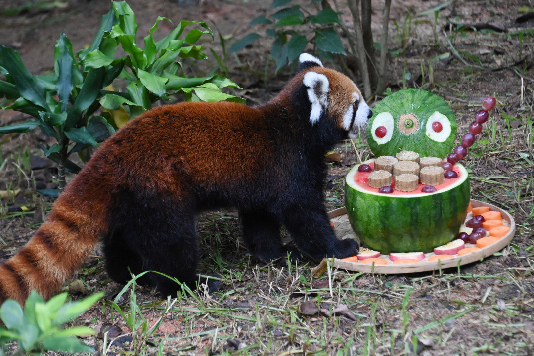 在小熊猫园,饲养员摆放好“月饼大餐”,小熊猫似乎早已嗅到了“月饼”清香,不慌不忙迎过来。其中西瓜做成的“水果拼盘”更是引起小熊猫的好奇,细细观察,并用鼻子嗅了一番味道后就开始品尝“月饼大餐”,十分得意的样子。