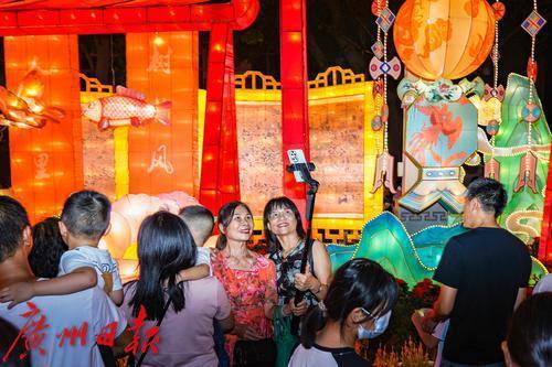 随着园中花灯亮起,不少观众也沉浸式游园,打卡拍照