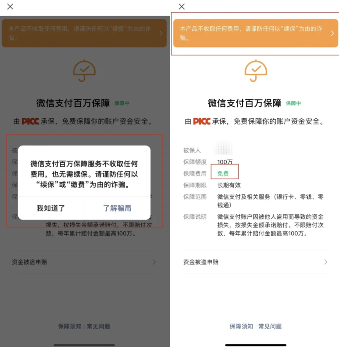 微信安全中心提醒,微信支付百万保障永久免费,只要使用微信支付即可享受。无“到期”“过期”等说法,不会要求“缴费续保”,更不会影响征信。凡是提及“到期续保、开通需缴费、客服协助取消”等均为诈骗,请勿轻信。