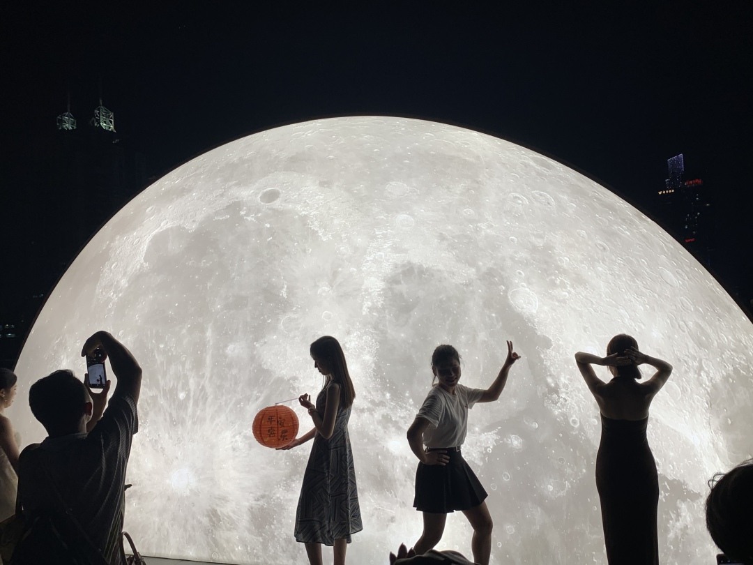 除了天上月亮,地上圆月也同样“吸睛”。今年多处地方都搭建了“月亮”模型,吸引市民打卡。在林和西路的高空,闪现了一个“超级月亮”,刷爆了线上各大平台。ICC环贸天地7楼的“超级月亮”,入夜后吸引了很多街坊游客前来打卡。在番禺区万博商圈的四海城也有三个人造“超级月亮”,有的出现在天台,有的则在广场上,让市民全方位赏月。