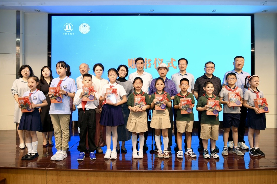 发布会现场,来自南京市芳草园小学、琅琊路小学、天正小学等学校,以及上海的学生代表上台,两位资深专家寄语青少年并为他们赠书。