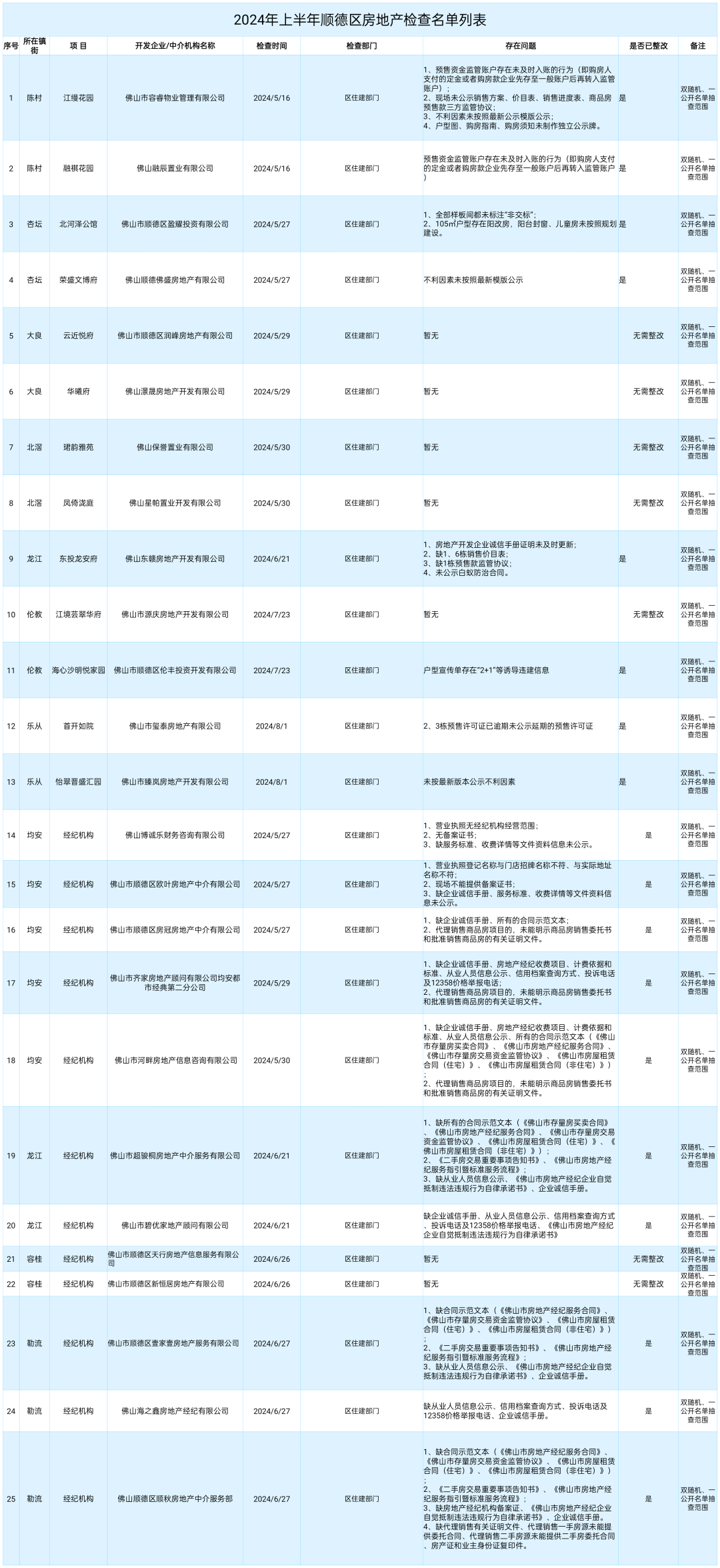 9月18日,记者从佛山市顺德区住房城乡建设和水务局获悉,今年上半年,该局联合顺德区市场监督管理局、各镇(街道)城建和水务办公室对全区部分新建在售商品房项目和房地产经纪机构开展了房地产市场专项检查。