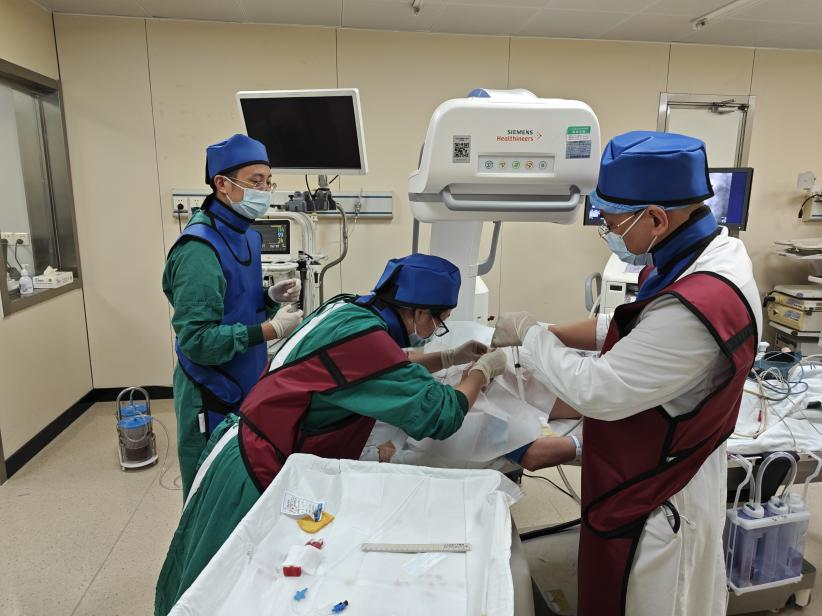 考虑到患者肺功能状态很差,气道狭窄,而且由于长年尘肺,右上肺支气管已经闭塞,专家团队认为无法为吴叔经气管实施肺减容计划。“我们马上组织了胸外科、放射科等多个科室进行会诊,经学科带头人谢灿茂教授查房后,最终决定采用经皮经胸腔微创介入治疗。”廖槐说。