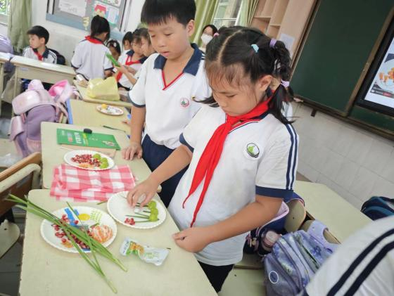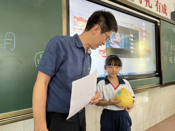 据介绍,北山小学以“琴(梳琴)、球(排球)、书(阅读)、花(茶花)”为特色。同学们发挥想象力,将柚子的果肉当作梳琴,又利用柚子巧绘排球。四年级的学生用上百合、虾滑,制作北山小学校园内常见的茶花。制作完中秋美食,他们还走上讲台讲述自己小组所做美食的名称和寓意。