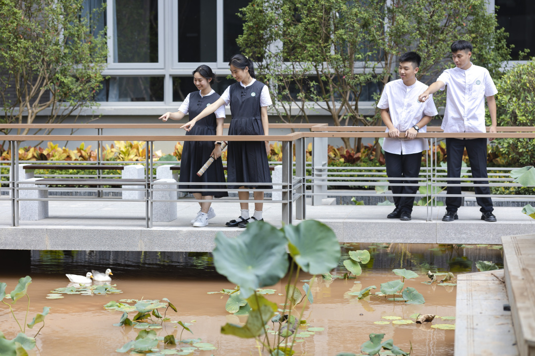 学校整体设计灵感来源于岭南特色建筑,古色古韵,外建筑以广府青砖为主,绿色植物枝繁叶茂,打造具有岭南文化特色的多维艺术公共空间。校内主体建筑包含图书馆、教学楼、行政楼、综合楼、宿舍楼,能够容纳在校学生约1700人。