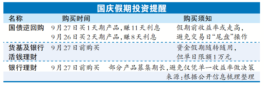在购买银行理财产品方面,目前多数理财产品的申购确认时间为“T+1”,投资者需在9月27日(周五)买入,假期可享收益。