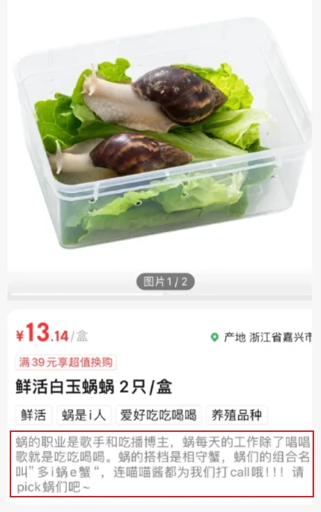 不仅如此,相守蟹还搭档上了白玉蜗牛。在商品描述中玩起了“蜗是i人”(我是i人)、“多i蜗e蟹”(多爱我一些)等谐音梗,让人看了哭笑不得。