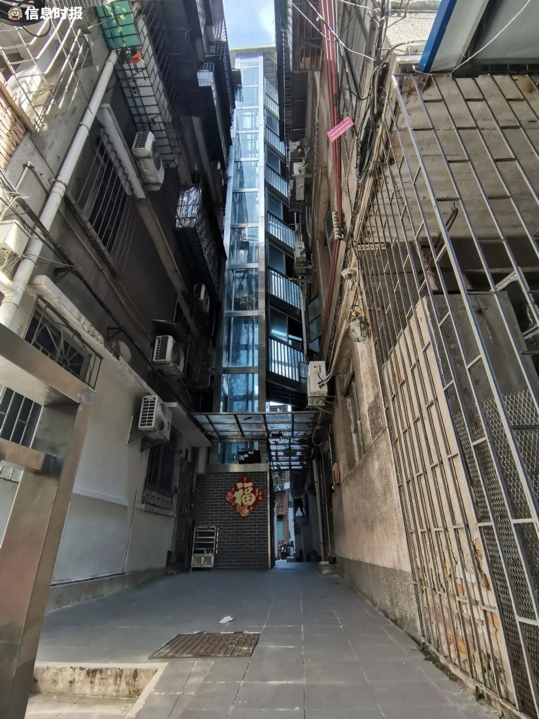记者看到,围墙拆除后,两栋大楼的距离只有3米多,加装的电梯仅为承载6人的小型梯。电梯内,两边电梯门旁边的内壁分别贴有“31~33号”“27号”红色大字作为指引,方便街坊辨认。此外,梯内还装上安全监控系统,便于管理的同时,也保障大家安全出行。电梯出入口位于楼梯的半层,连通两栋住宅。其中,靠近31~33号大楼一侧有一条斜着的长廊。两栋楼的住户只需步行半层即可轻松出入。