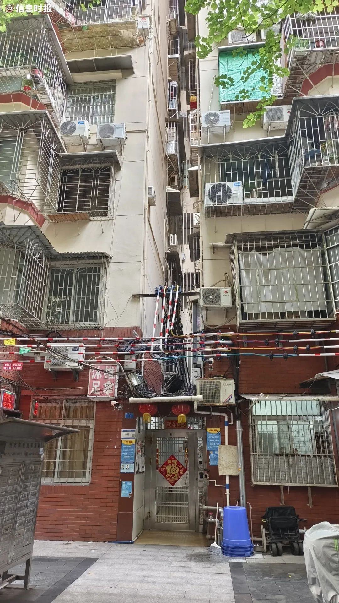 周门街11号是荔湾区彩虹街道周门社区辖内一栋楼龄超过30年的住宅楼,由两栋9层高的居民楼组成,楼与楼之间由共用的连廊连接,整体形状类似“凹”字,内部设“剪刀型”楼梯供居民出行。