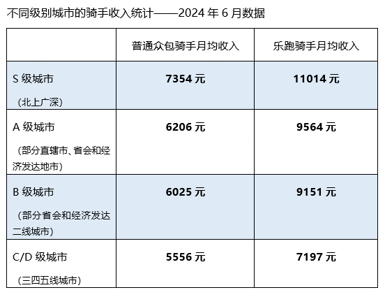 报告显示,如果一个骑手全年跑单超过260天,日均接单时长在6小时以上,其收入在当地具有一定竞争力。以2024年6月为例,如果骑手在一线城市跑单,月收入可达7354元以上,如果在三线及以下城市,月收入可达5556元以上。