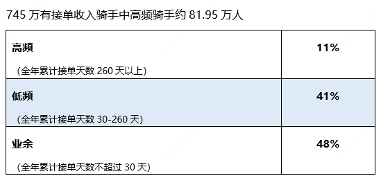 研究院表示,745万有接单收入骑手中,全年接单在260天以上的占总人数的11%,大约81.95万人;约48%的有接单收入骑手,全年接单不足30天。