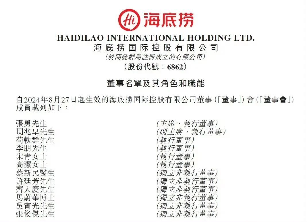 8月27日,海底捞披露最新董事名单及其角色和职能,其中霸王茶姬创始人张俊杰名列其中/图源:海底捞公告