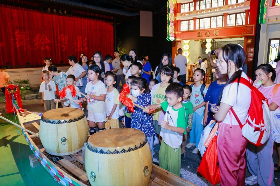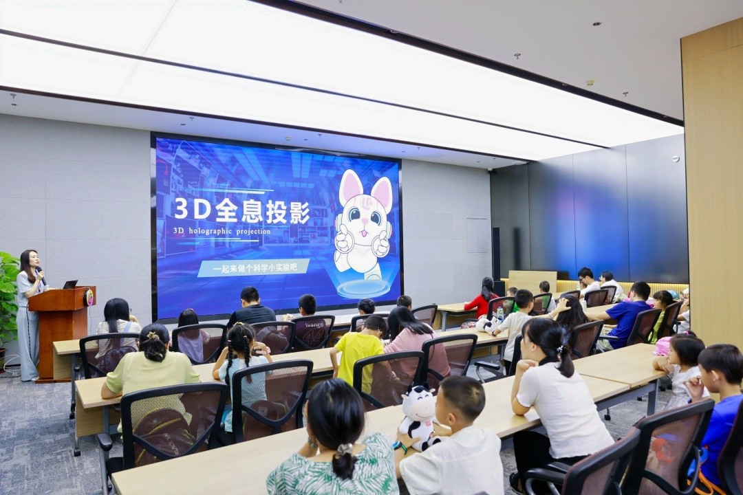 在基地展厅中,沉浸式体验3D裸眼技术应用带来的二十四节气中国式浪漫的内容演绎;在创意展示区,感受应用不同形状的屏幕展示艺术之美;在“未来之境”沉浸式体验空间里,观赏具有强烈视觉冲击力的影片星际启航,活体印刷字;在岭南非遗体验区,品味岭南画派、岭南音乐、全息粤剧“岭南三秀”的韵味……全程参与的亲子们以观察、听讲、体验、实践相结合的领会形式富有科学性、趣味性的科普知识。