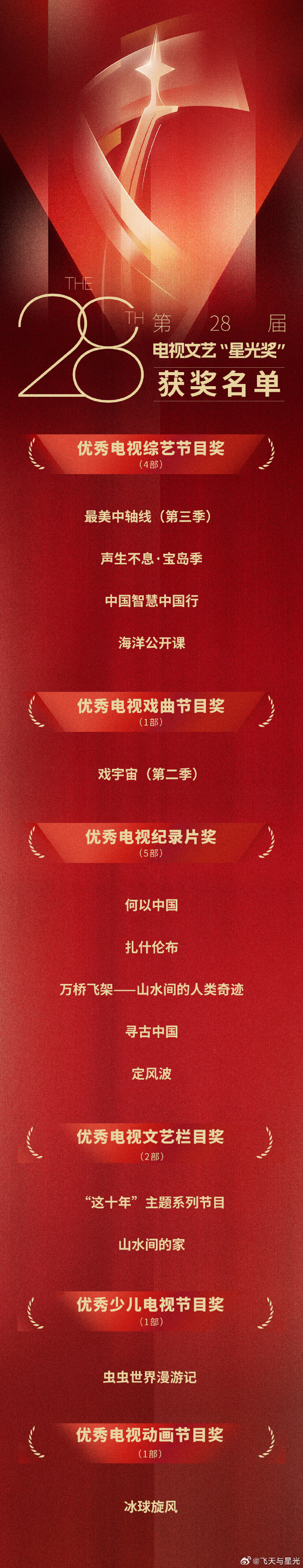 “星光奖”方面,《最美中轴线(第三季)》《声生不息·宝岛季》《中国智慧中国行》《海洋公开课》率先赢得“优秀电视综艺节目”荣誉,《戏宇宙(第二季)》获“优秀电视戏曲节目奖”,《“这十年”主题系列节目》《山水间的家》获得“优秀电视文艺栏目奖”,《何以中国》《扎什伦布》《万桥飞架——山水间的人类奇迹》《寻古中国》《定风波》荣获“优秀电视纪录片奖”,《冰球旋风》摘得“优秀电视动画节目奖”,《虫虫世界漫游记 》荣获“优秀少儿电视节目奖”。