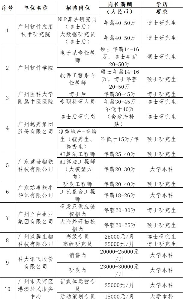 活動共吸引了20家在穗企事業單位報名,面向港澳地區提供優質崗位逾1400個,涵蓋生物醫藥、人工智能、醫療衞生、教育、汽車科技、通訊設備、科學研究和技術服務業等多個行業。其中,廣州醫科大學附屬中醫院、廣州軟件應用技術研究院、越秀集團等單位招聘博士後年薪超過40萬元人民幣。