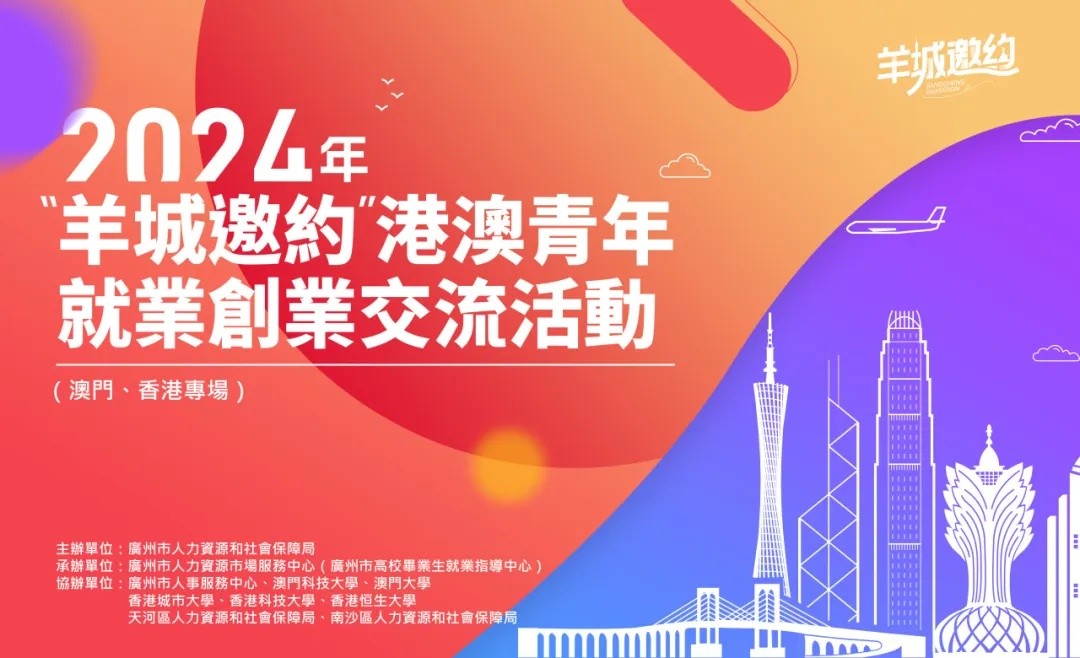 2024年9月23日-26日,由廣州市人力資源和社會保障局主辦的“羊城邀約”港澳青年就業創業交流活動(澳門、香港專場)將在澳門科技大學、澳門大學、香港城市大學、香港科技大學、香港恒生大學舉辦。活動為港澳青年拓展更多精準就業崗位,吸引更多港澳青年走近廣州、走進灣區,以“羊城邀約”搭建交流橋樑,深化穗港澳三地青年交往。