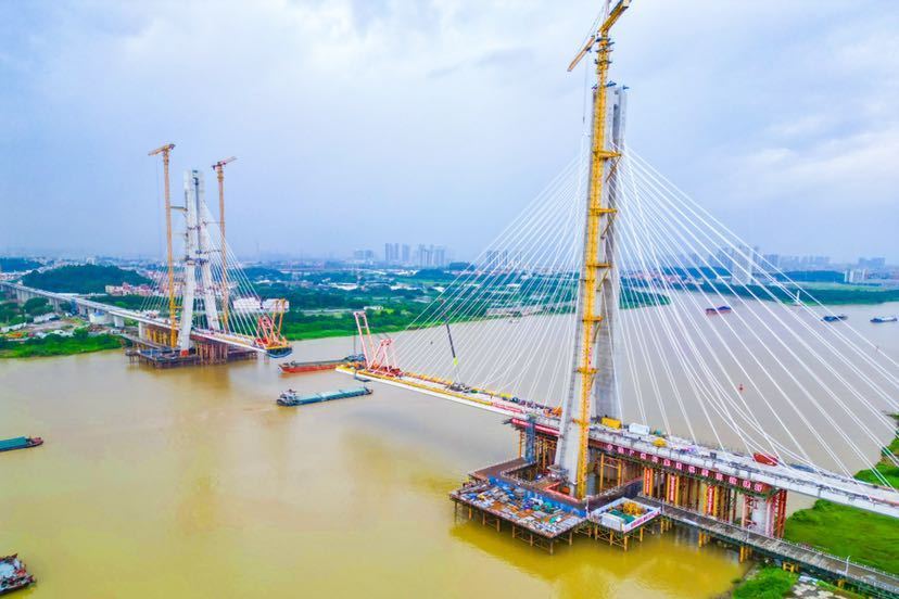 9月21日,在中铁广州工程局集团承建的广湛高铁佛山特大桥跨东平水道斜拉桥施工现场,建设者们正在进行大桥钢梁架设和挂索施工,项目建设如火如荼。