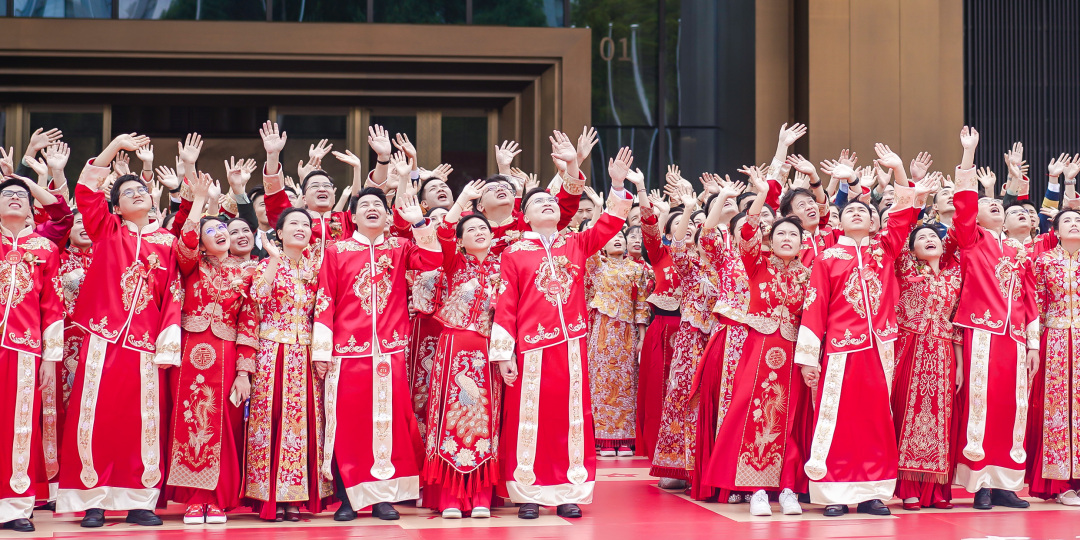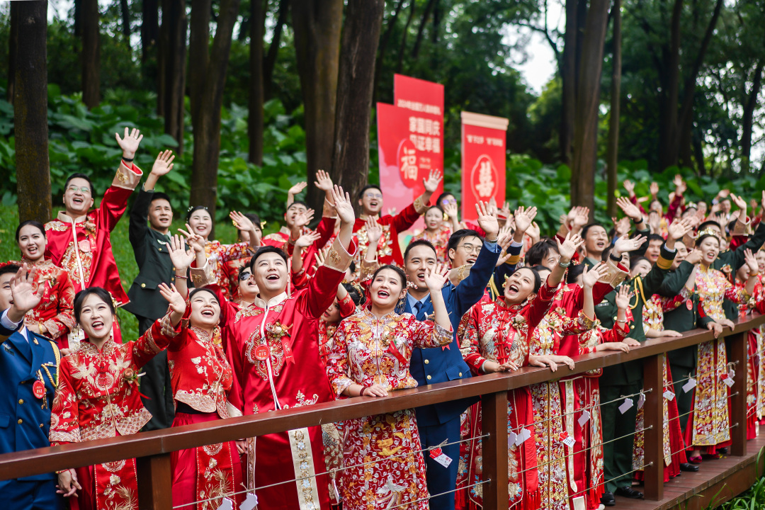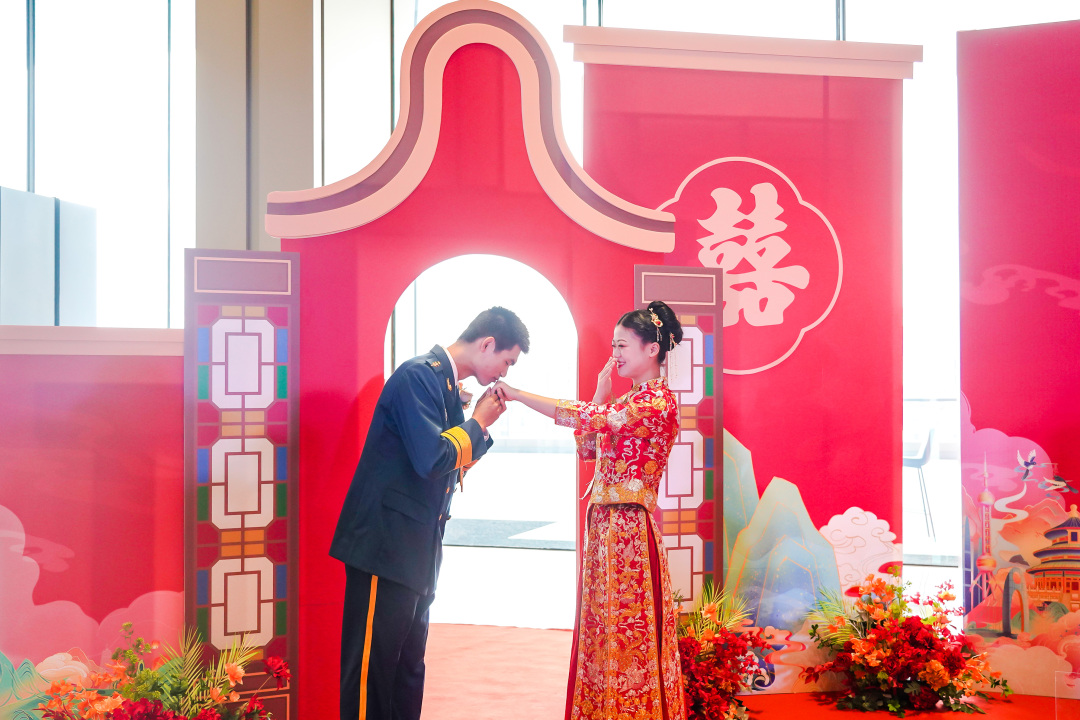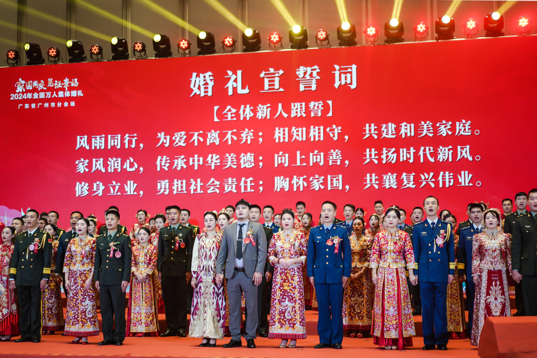 广州分会场婚礼仪式庄重而温馨,与北京主会场同步进行。婚礼仪式上,军人新人着军装亮相,其他新人着中式婚服出场,既保留传统文化又结合现代时尚元素。每一对新人脸上都洋溢着幸福的笑容,在亲朋好友及社会各界的见证下,作揖拜堂,交换婚戒,许下了相守一生的誓言,并发出“弘扬新型婚育文化”的倡议,倡导简约适度的婚俗礼仪。家是最小国,国是千万家,活动主办方用集体婚礼的形式把小家与祖国大家庭紧密相连,用深情与爱意向祖国母亲告白,以家国情怀赋能青春逐梦。