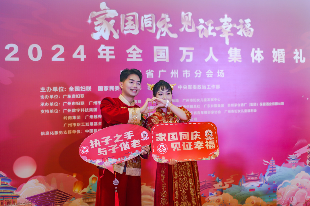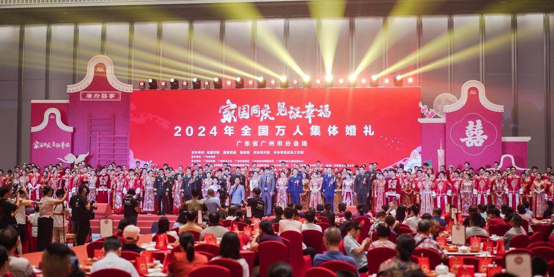 9月22日,“家国同庆 见证幸福”2024年全国万人集体婚礼在全国50个城市同步拉开帷幕。广州作为重要的分会场之一,89对新人(来自19个省份,跨21个行业)携手步入婚姻殿堂,现场500余人共聚一堂为新人送上衷心祝福。本次活动由全国妇联、国家民委、民政部、农业农村部、中央军委政治工作部主办,广东省妇联协办,广州市妇联、广州市总工会、广州市民政局、广州市林业和园林局、广州市妇女儿童发展中心共同承办。