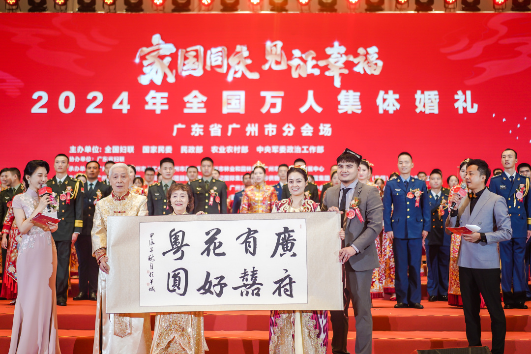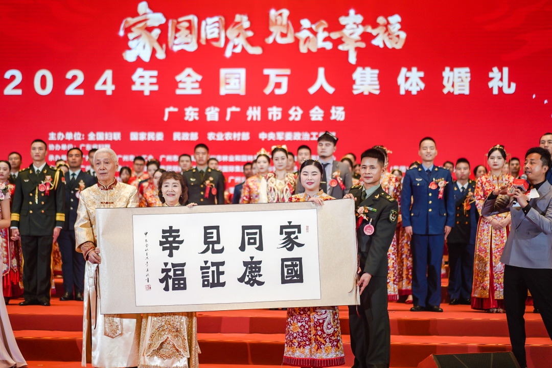 婚礼现场洋溢着新婚伉俪的甜蜜与憧憬,更承载着跨越时光的深情与坚守。金婚伉俪小云雀合唱团创始人吴冠明夫妇在婚礼仪式上为新人代表送上“家国同庆 见证幸福”“广府有喜 花好粤圆”书法作品及祝福。“我们结婚51年了,今天见到这么多新人在这里举办集体婚礼很有感触。希望年轻人珍惜相遇,携手白头,更希望每一对新人的生活像阳光一样灿烂。”吴冠明向在场新人寄语。金婚老人50余年风雨同舟、相濡以沫的爱情故事也给在场的每一个人带来了关于生活爱情婚姻的启示,让每对新人都能从中汲取力量,勇敢前行,在爱的路上并肩同行,携手讲好新时代爱情故事,共同书写和谐家庭幸福生活的美好未来。