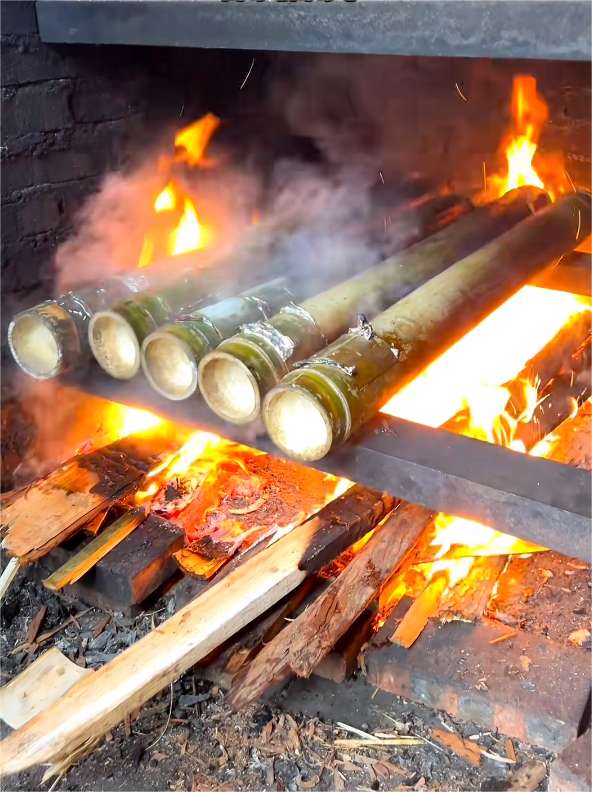 而正宗的竹筒饭并不是蒸煮或用电烤炉烘烤出来的,而是用明火炙烤出来的。首先要拣上等的香糯竹,竹子为一年的竹,因其水分多、受热快、耐烧烤,同时其特有的双层乳白色内膜能将米饭的香味紧紧包住,等待着烧熟劈开竹子之后的刹那释放。然后进行切割、开口、清洗,再装好食材备用。有经验的师傅介绍,竹筒饭在炙烤的过程中要注意避免火候过大导致竹筒烧焦,这就要不断往竹筒上浇水,防止竹筒被烧穿。