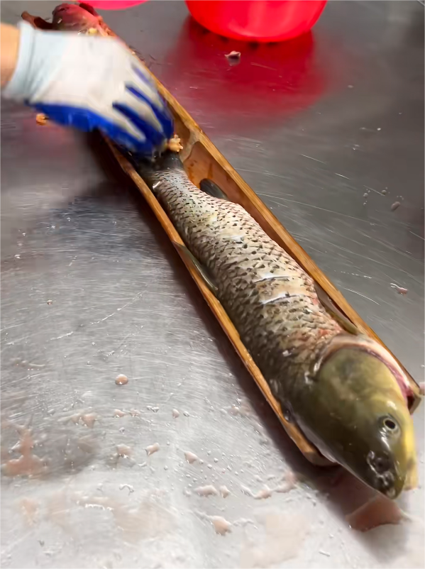 烤好的竹筒饭取下后,拍打竹筒使之变软,手气好的话,竹子里面的那层竹膜会将米饭完整地包裹好,便获得一条圆柱形的竹筒饭,白润晶莹、竹香扑鼻,堪称完美。