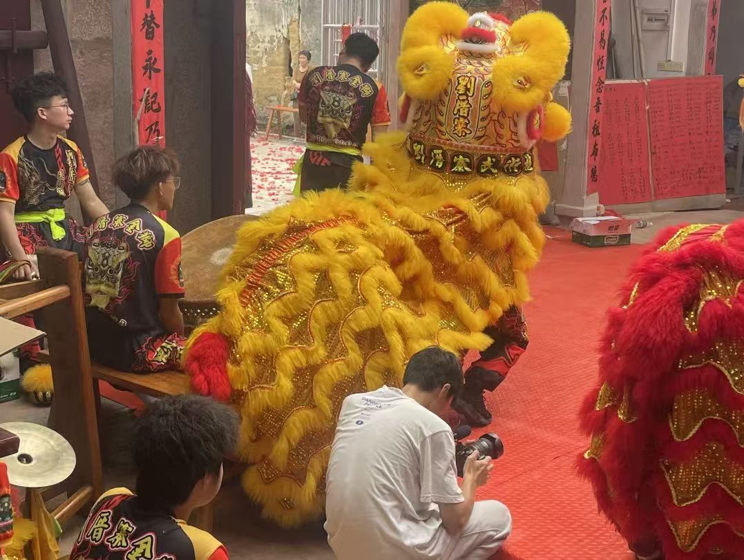 9月19日,天微亮,由学院李通老师带队的摄影小组便前往揭西县各非遗项目点,对朱家教拳、郭氏腊肠、金狮等非遗项目的传承人进行跟拍与采访。袁川晔老师则带着同学们赶赴元合酱油基地,放出无人机,对基地来了一段全景扫描。对于技术娴熟的师生们来说,基础性的记录并不难,但这些非遗项目类型有别,源流各异,各自的传承情况,以及面临的市场环境都有不同,在拍摄的过程中如何找准每个项目的“关键点”,发现它们各自的“长板”“短板”,对于激活产业潜能,促进乡村振兴来说,才是最重要的。“一路拍下来发现,更多的工夫其实是在镜头之外”,有学生感慨地表示,在拍摄中大家不断在交流,怎样让传承人能够畅谈心声,怎样能够尽可能深入地了解各个非遗项目传承发展的文化背景、市场逻辑。这绝不是走马观花,而是建立在忠于实际、勤于实践基础上的严肃工作。