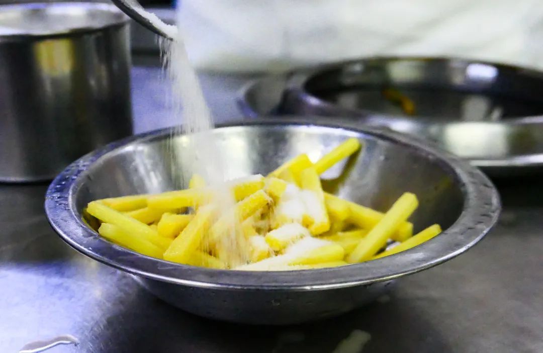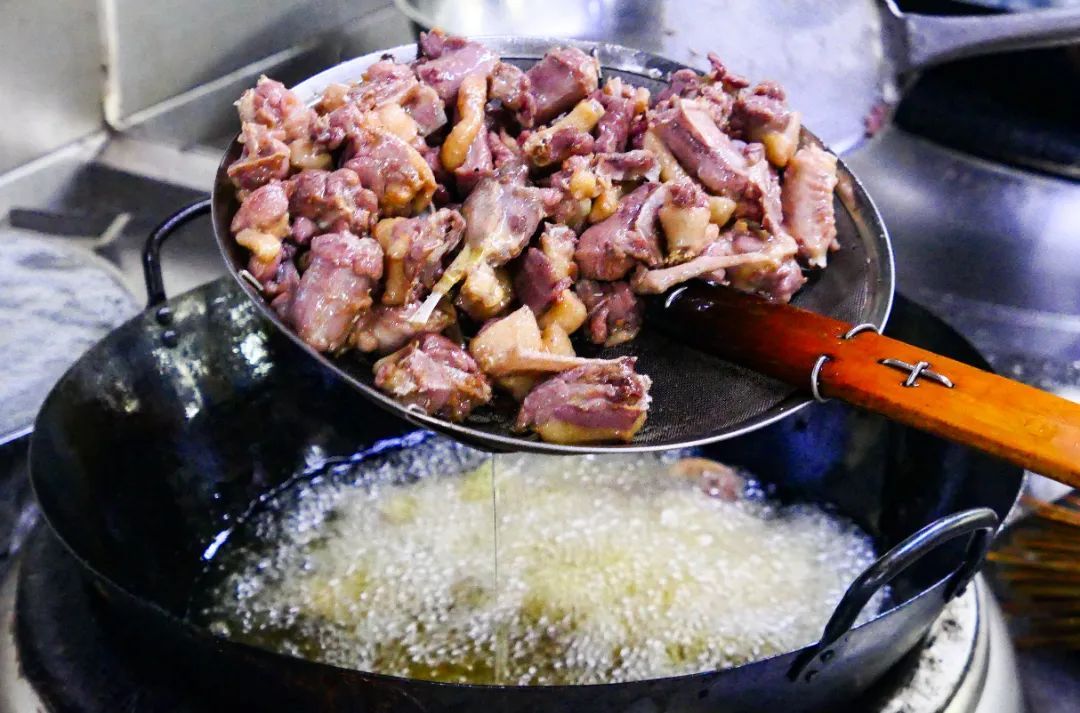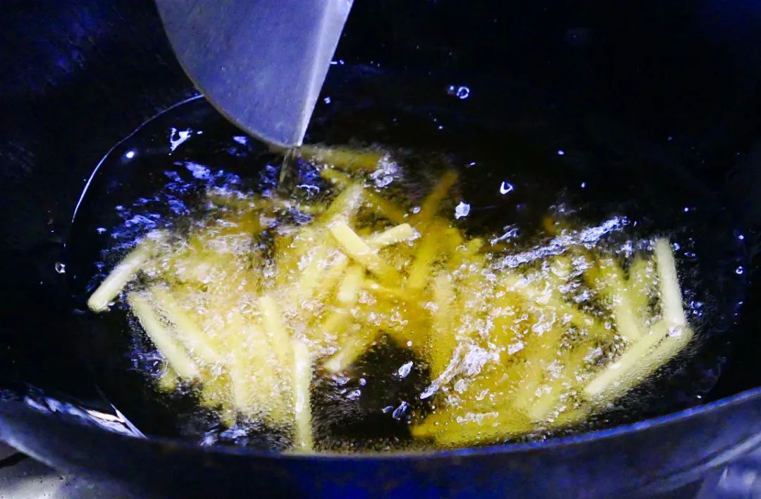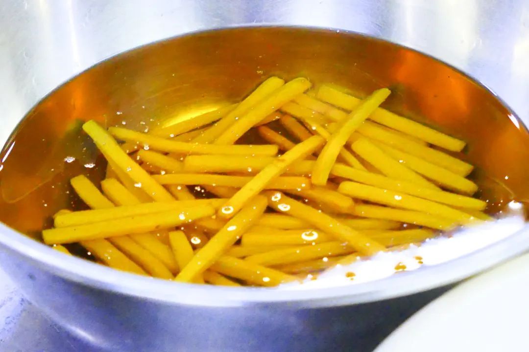 鸭已准备就绪,姜油何时登场?别着急。“姜炼油前,要用盐腌制10分钟左右,这样既能减少姜的辣味,又能增添一点盐味,吃起来才爽脆且够味。”待姜条腌至软身后,还需“啤水”冲走多余的盐味,廖嘉妥拿起一条姜试了一口,表示“可以了”,炼油才正式开始。和提炼葱油一样,炸姜条的油温不能太高,用100℃低油温浸炸,慢慢炸至稍显圆身的状态。“姜不能炼得太老,吃着才爽口,纤维感不能太明显。”原本鹅黄色的姜条逐渐镀上一层金边,口感也变得爽脆。