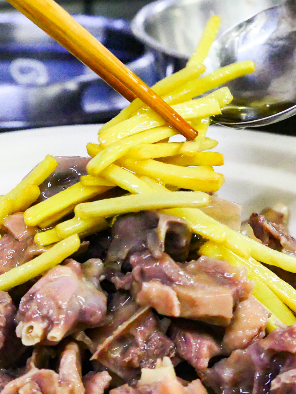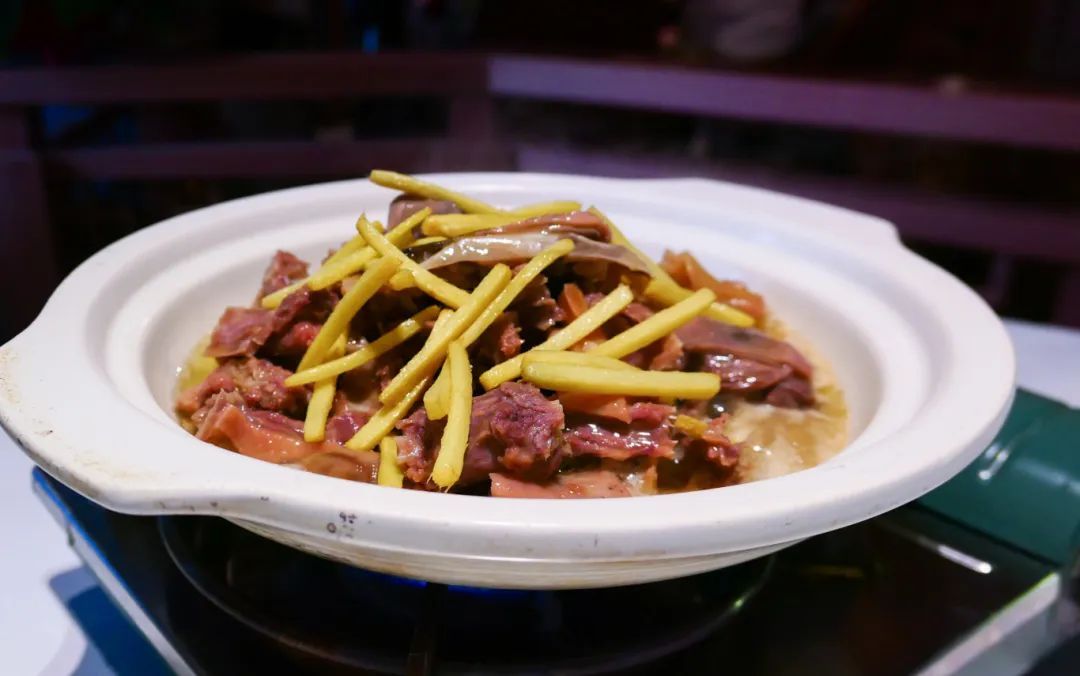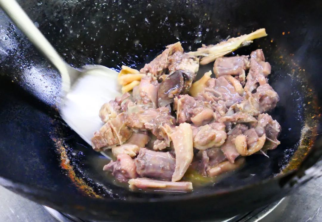 被盛放于砂锅里的鸭肉,淋上花生油,与炼过油的姜条共冶一炉,上桌后边煮边吃。一口鸭肉一口姜,就像廖嘉妥所说,这道菜越吃越香,越吃越有味。