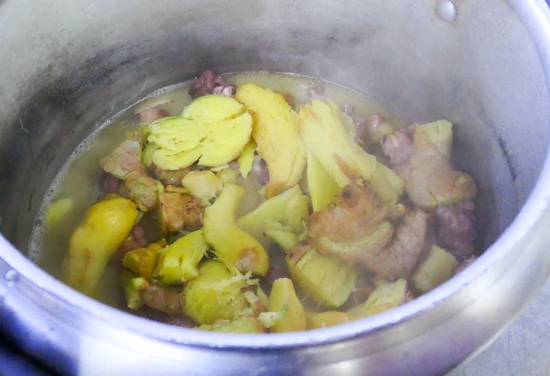 3.将鸭肉、一斤老姜和鸡汤一起倒入压力锅里。压力锅升压后,焖4分钟即可。滤出汤汁和鸭肉留用。