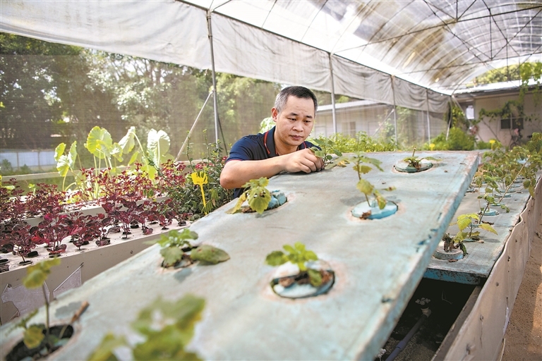 说起石牌广藿香的来处,曾烦金表示,2018年,广州中医药大学中药资源科学与工程研究中心从几株石牌广藿香母苗上剪了一些枝条,送到基地,开展气雾栽培快速生根技术扩繁实验。“没想到,这种气雾栽培方式对于石牌广藿香繁育具有明显效果,从最初的几根枝条,到高峰时几万株,慢慢地在基地形成了一片石牌广藿香园圃。”
