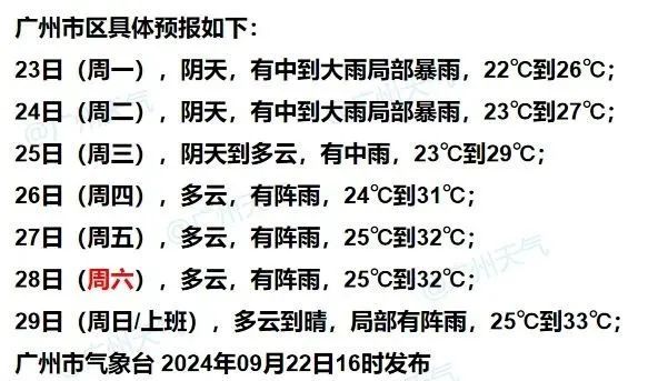 广州市气象台预计,9月23日—24日,受季风槽北抬和弱冷空气影响,广州有中到大雨,体感清凉。主要降水时段:今日午后到夜间,重点关注区域:南部及东部地区(南沙、番禺、增城);