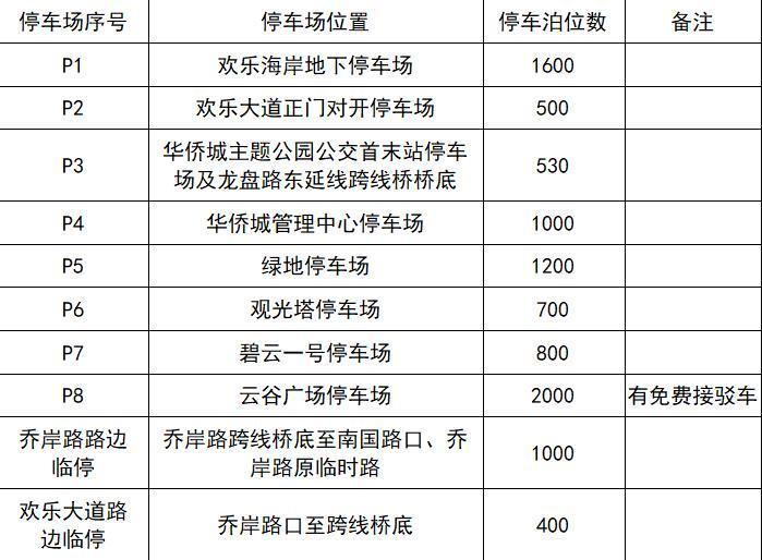 (1)十一假期期间,华侨城提供停车场8个,并新增临时停车位,开放乔岸路(乔岸路跨线桥底至南国路口)、乔岸路原临时路、欢乐大道(乔岸路口至跨线桥底)等部分道路路段两侧供车辆临时停放,约提供停车泊位约9730个。