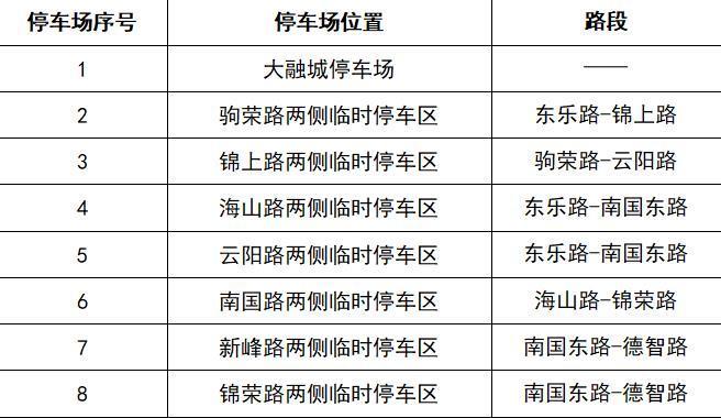 (2)十一期间新增临时停车场,开放大融城、及驹荣路、锦上路、海山路、云阳路、南国东路、新峰路、锦荣路等部分道路两侧供车辆临时停放,共约提供停车泊位约2660个。