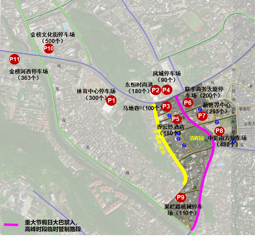 十一期间清晖园片区通行要求及停车场分布情况示意图: