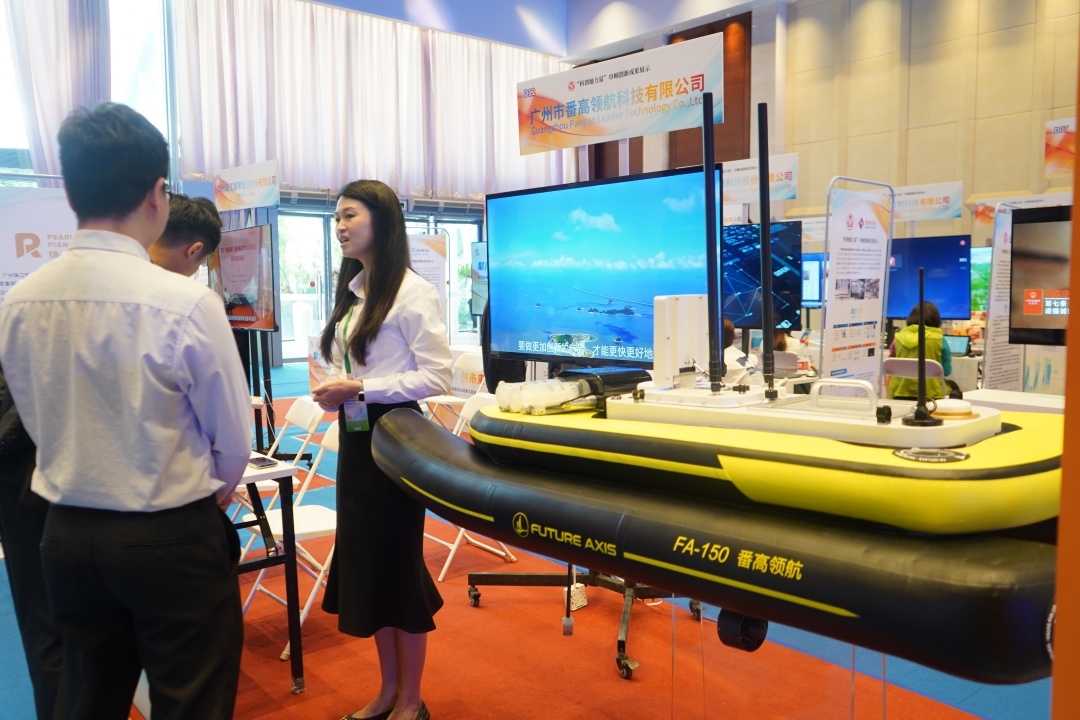 由广州市番高领航科技有限公司带来的一款无人艇也吸引了很多人的目光。这款无人艇将用来探测河湖水质,展区负责人表示,“只需事先设定,这艘无人艇就可以开到相应位置采样,艇的电池续航能力能达到4个小时,并且可以加载模块,实时汇报水样数据,这就比人力开一艘采样船大大节约了能源和人力成本。”