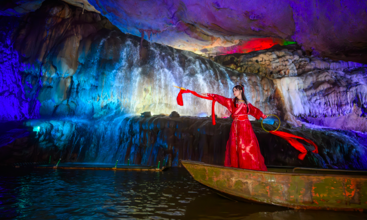 最后前往连州。《黑神话:悟空》游戏话题在网络上持续发酵,国家5A级旅游景区连州地下河特别在洞内矗立了一根高达6.5米的“如意金箍棒”和一尊威风凛凛的“大圣雕塑”供游客拍照。连州地下河以其神秘瑰丽的钟乳石景观及洞穴暗河蜚声中外,各种天然奇观与仙侠世界的风格特别契合。