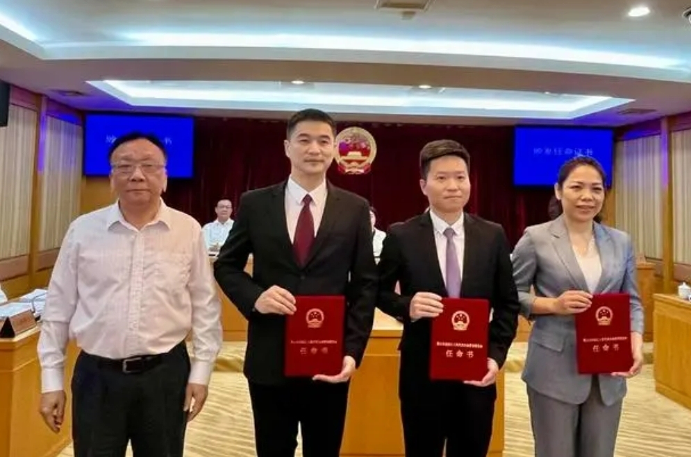 南海区人大常委会副主任林健为谢泳娴、梁耀智、肖卓颁发任命证书。(图片来源:佛山新闻)