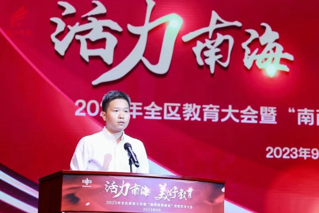 时任南海区工商联党组书记、常务副主席的梁耀智主持“南商教育基金”奖教奖学大会。(资料图片,来源:珠江时报)