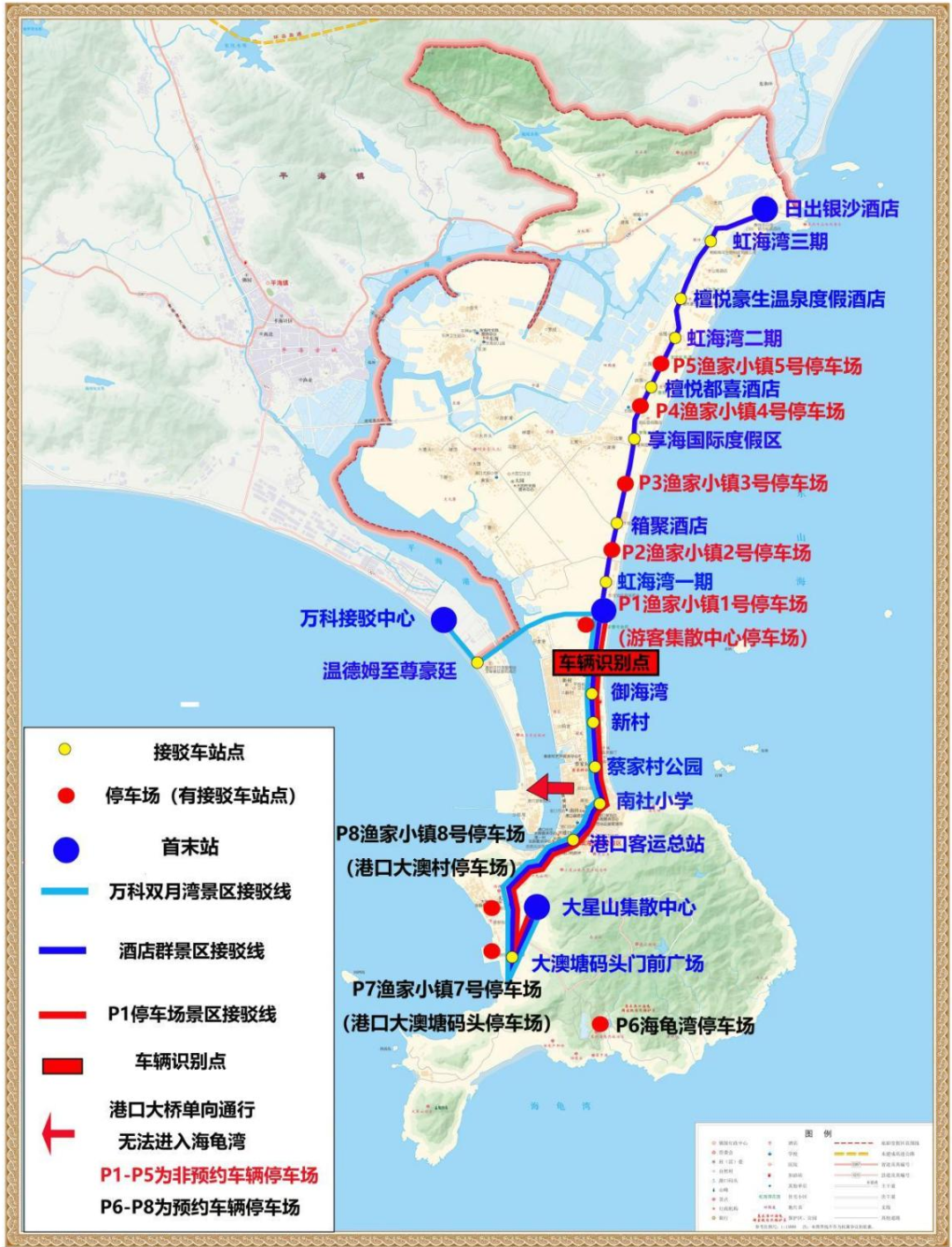 实施临时交通管理期间,7座及以下机动车进入海龟湾景区实行网上预约,预约成功后凭“通行码”通过车辆识别点;非预约车辆集中停放在临时管理区域外围5个停车场;港口大桥(即港口老桥)实行单向通行管理,即经过沙咀尾车辆不能途经港口大桥前往海龟湾景区。