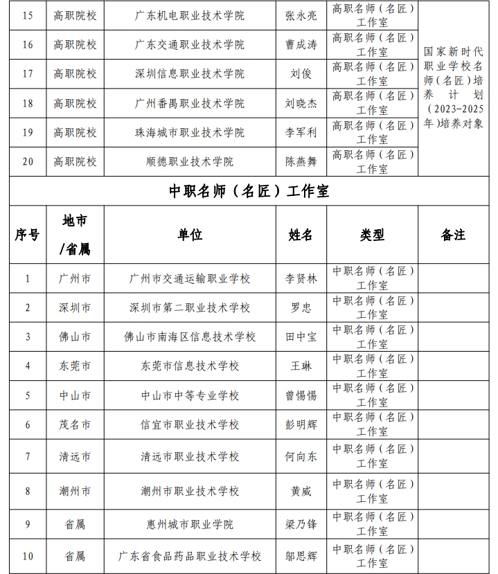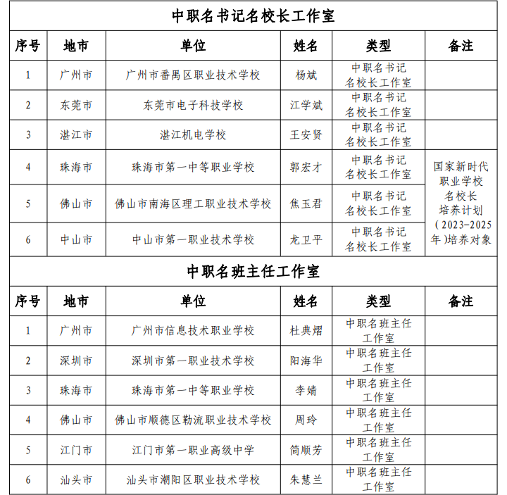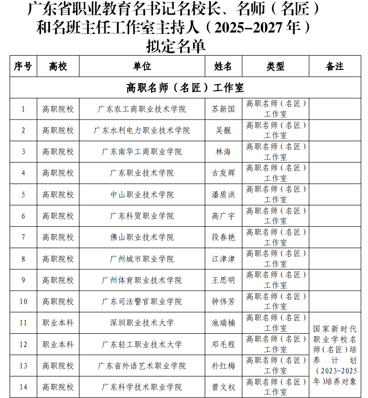 9月26日,广东省教育厅对广东省职业教育名书记名校长、名师(名匠)和名班主任工作室主持人(2025-2027年)拟定名单进行公示。