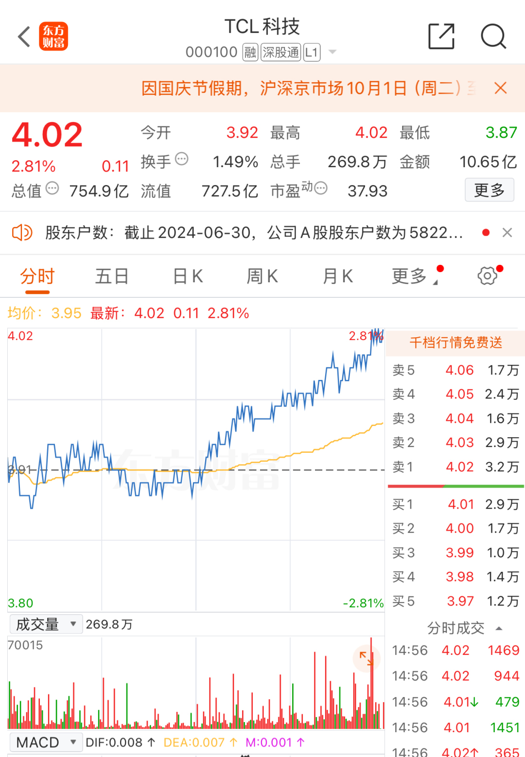 截至9月26日收盘,TCL科技报收4.02元/股,上涨2.81%。