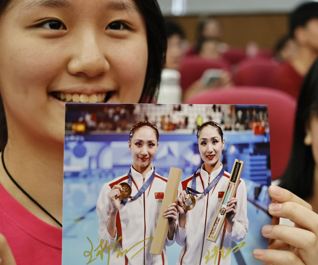 巴黎奥运会,双胞胎组合王柳懿、王芊懿助力中国队夺得我国奥运历史上首枚花样游泳集体项目金牌,并在之后的双人项目中再次夺金,成为“双冠王”,让世界看到中国的美。报告会甫一开始,她们就在现场再现了比赛的开场动作,赢得台下阵阵欢呼。