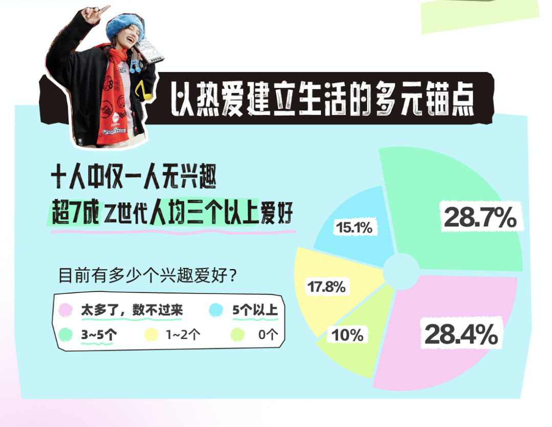 有趣的是,从年轻人的选择来看,食玩,咕卡、手账、捏捏等DIY手工、三坑(JK、汉服、洛丽塔)这些曾经“小众”的兴趣爱好也进入了热门选项前八位。
