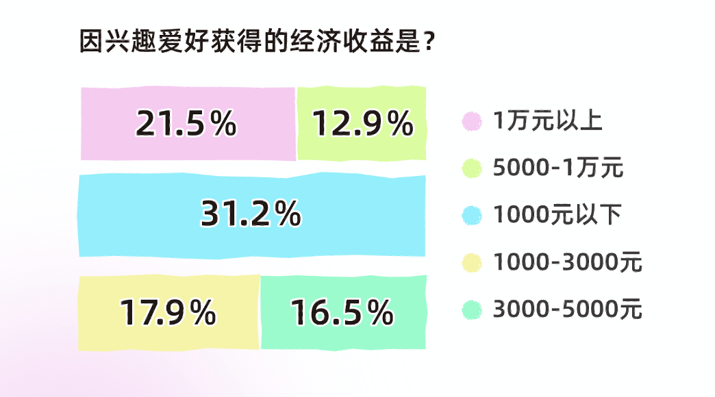 值得一提的是,有15.2%的年轻人表示兴趣爱好已经为其带来了收入。其中,因兴趣爱好获得经济收益1000元以下、1000元~3000元、3000元~5000元、5000元~1万元和1万元以上的比例分别为31.2%、17.9%、16.5%、12.9%和21.5%。