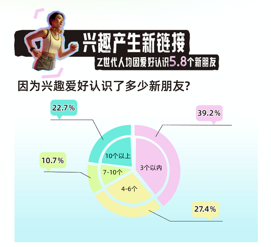此次调研显示,Z世代平均因爱好认识5.8个新朋友,39.2%的年轻人因兴趣爱好结识3个以内的新朋友,27.4%结识4~6个新伙伴,10.7%则认识了7~10个新朋友,甚至有22.7%的认识了10个以上新朋友。