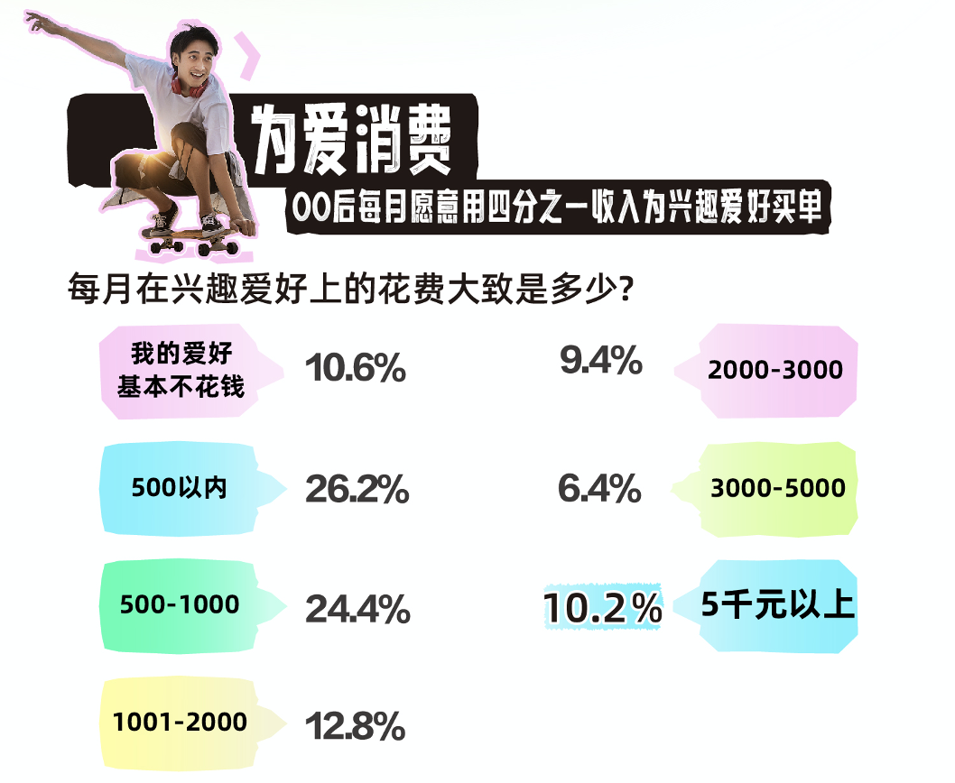 调研显示,总的来看,年轻人平均每月“为爱”消费1645元。而对比年轻人的税后月收入,这已经算是不小的一笔支出。特别是对刚刚步入职场、拥有独立经济能力的00后来说,他们每月愿意花费税后月收入的四分之一为爱好买单,获得情绪反馈。
